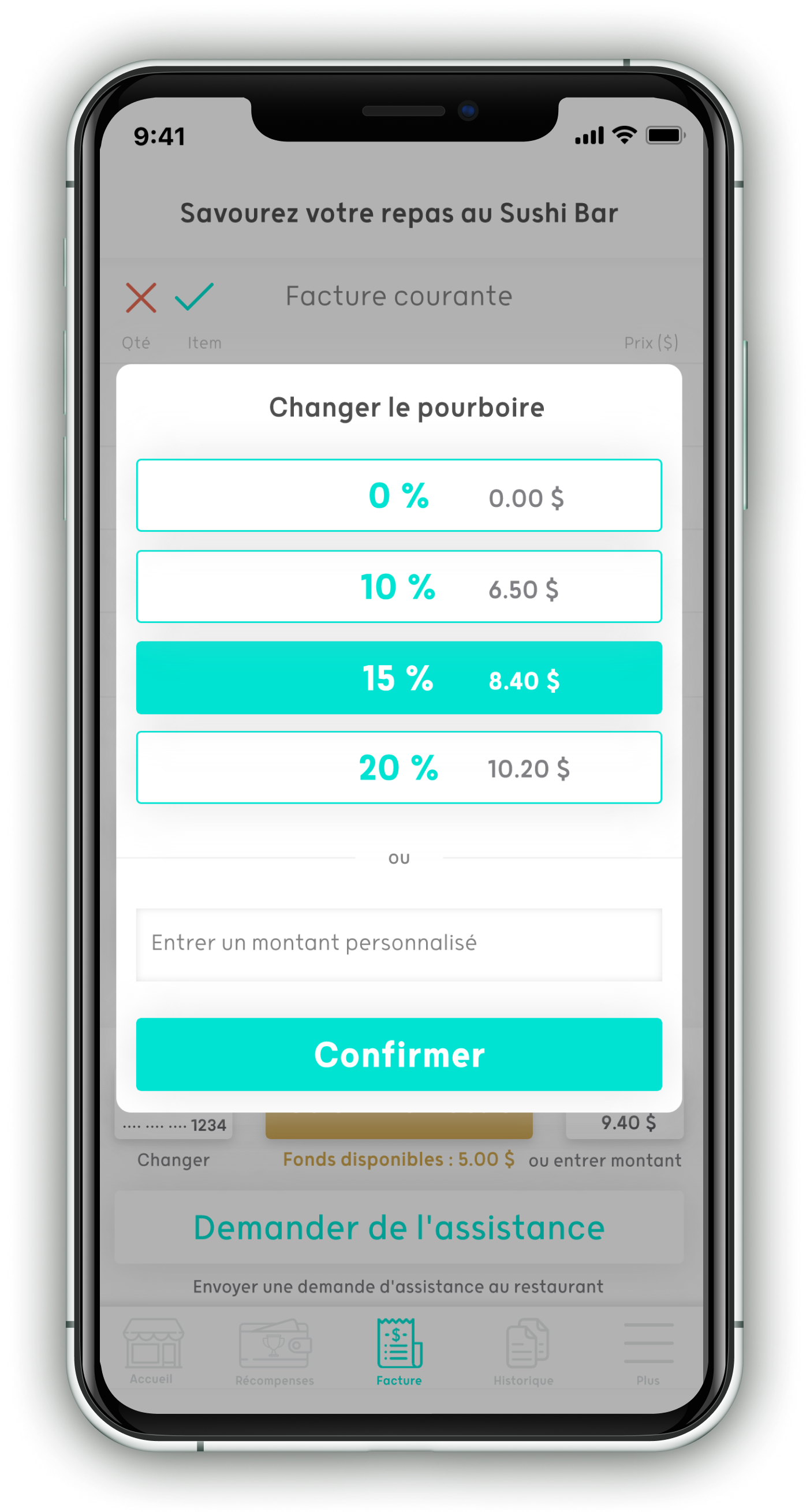 - Ajustez le pourboire jusqu’à 15 min après avoir quitté le restaurant